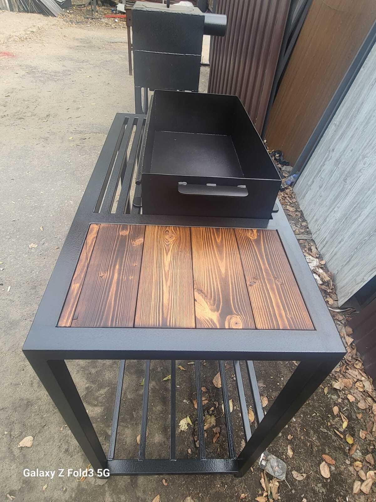 Стильный и практичный мангал с деревянным столиком — идеальный выбор для дачи или загородного отдыха. Изготовлен из прочного металлического сплава, устойчивого к высоким температурам и коррозии. Боковой столик из натуральной сосны придает изделию уютный, природный вид и удобен для размещения посуды, специй и продуктов во время приготовления.